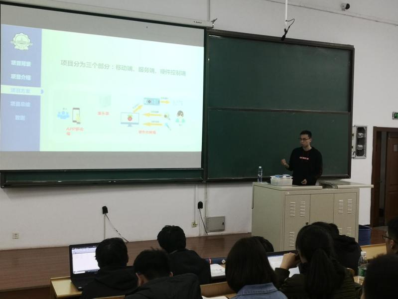 此外,刘金龙老师讲解了全国大学生物联网竞赛的有关事项,并请物联网竞赛国奖获得者魏谨学长和谭笑学长分别讲解各自的项目经验。两位学长介绍了获奖项目的创意构思、实现方案、研究方法等,并通过视频为同学们展示了最终效果。