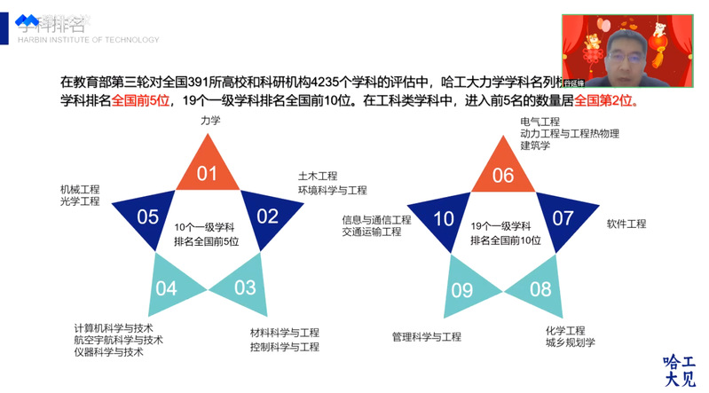 2月5日,为抓住春节假期考生和家长的宝贵空闲时间,招生组开展了2022年第一场河南专场线上宣介会。谷延锋教授代表河南招生组进行了招生宣讲,从学校概况、科学研究、人才培养、学习生活和报考指南等方面做了详细讲解,王瑞玲和楼云江两位书记也分别对威海校区和深圳校区进行了重点介绍,本次宣讲参会人数近千名,考生和家长们踊跃提问,工作人员在线积极答疑解惑,获得了考生和家长们的高度认可和一致好评。