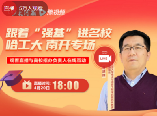 4月20日晚,电信学院通过“哈尔滨工业大学招生办”微博平台,连线河南日报报业集团《大河报》官方微博,重点面向河南考生及家长,进行了我校强基计划的直播宣讲活动,吸引5万余人在线聆听。