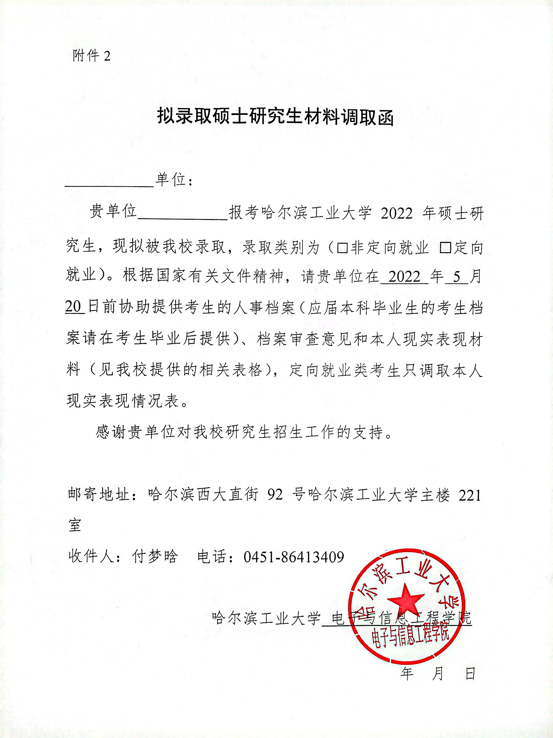 1、《拟录取硕士研究生材料调取函》(附件1)、《哈尔滨工业大学2022年拟录取硕士研究生现实表现情况表》(附件2)已作为附件上传,请同学们自行下载打印后使用。