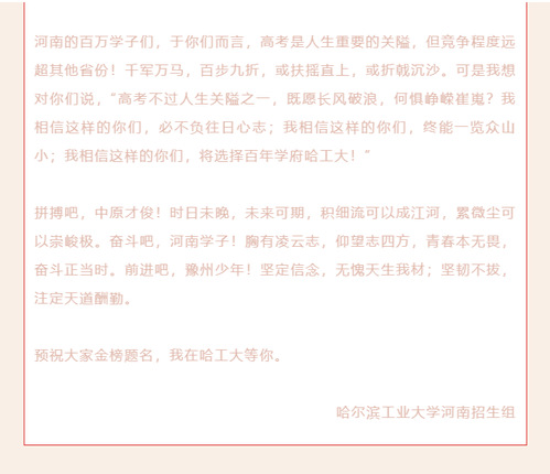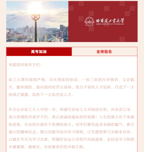 5月初,在高考倒计时30天之际,哈工大河南招生组在招办微信公众号发出“来自哈工大的祝福:致河南高考学子的一封信”,国家级高层次人才、天游ty8线路1线路2检测中心副院长谷延锋教授代表河南招生组,为中原学子送上鼓励与祝福。