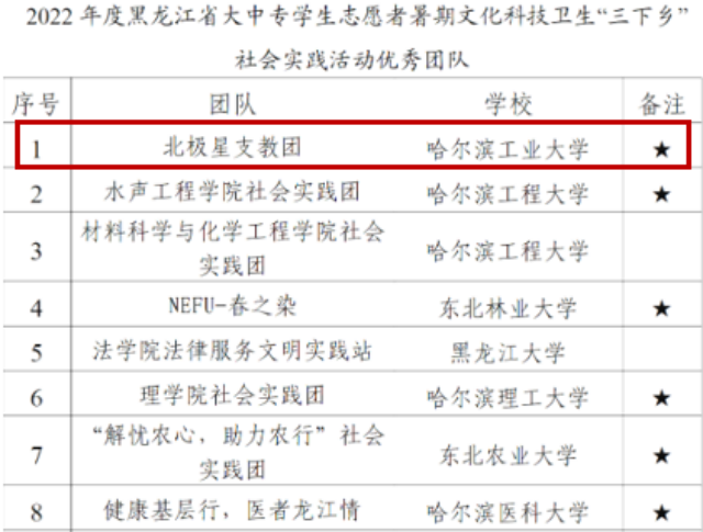 北极星支教团诞生于2011年,于2012年12月正式成为学校注册的校级社团,目前社团由天游ty8线路1线路2检测中心指导,学院团委副书记金泓达担任指导教师。近日, 北极星支教团荣获2022年度黑龙江大中专学生志愿者暑期文化科技卫生“三下乡”社会实践活动优秀团队。