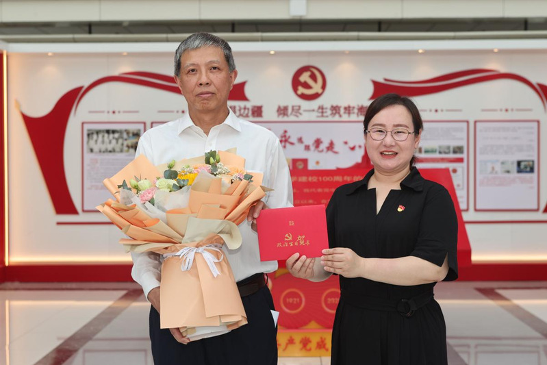 党委书记单既阳为校十佳优秀共产党员郭庆同志颁发政治生日卡