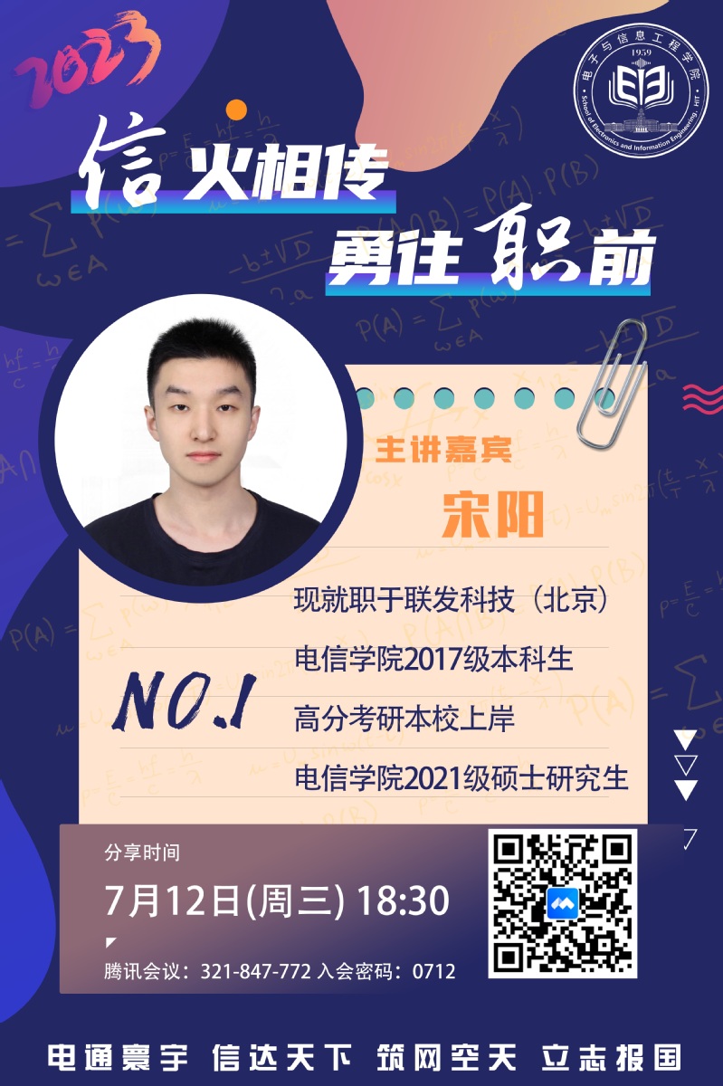为帮助同学们做好学业生涯规划和职业选择,及时做好升学或就业的相关准备,7月12日晚,天游ty8线路1线路2检测中心团委组织开展2023年“信火相传·勇往职前”系列分享第一期,本次分享会邀请了2021届本科毕业生、2023届硕士毕业生宋阳就考研升学规划和求职经验进行线上分享,会议由孙永政老师主持。