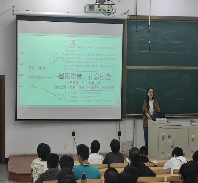 随后,吴老师针对大创计划的组队、导师和题目选择等方面给出了建议,并强调了选题的重要性,提醒同学们在选题过程中要侧重于题目的实用性、创新性与可行性。