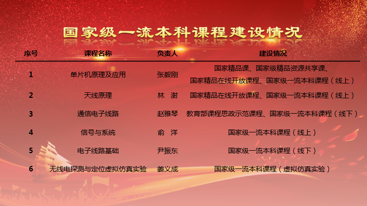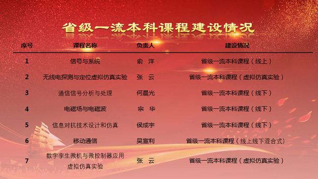 2023年10月,黑龙江省教育厅公布了第三批省级一流本科课程名单,来自全省高校504门课程入选第三批省级一流本科课程。我院何晨光老师负责的《通信信号分析与处理》、宗华老师负责的《电磁场与电磁波》、侯成宇老师负责的《信息对抗技术设计和仿真》入选线下一流课程,吴宣利老师负责的《移动通信》入选线上线下混合式一流课程,张云老师负责的《数字孪生微机与微控制器应用虚拟仿真实验》入选虚拟仿真实验教学一流课程。截至目前,我院共有国家级一流本科课程6门,省级一流本科课程7门。