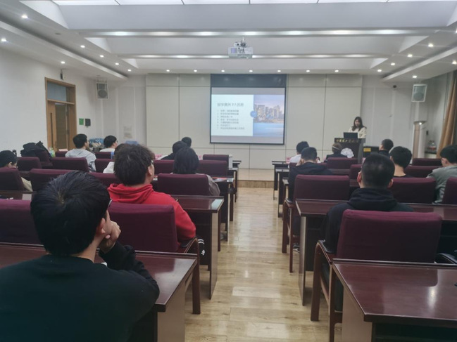 宣讲会上,悉尼大学中国招生办的老师向在会的三十余名师生介绍了学校的学科实力、宿舍环境、留学学制以及奖学金等情况。澳洲国立大学中国招生办的老师向同学们介绍了学校优势专业、地理位置及周边配套设施,并详细说明了申请入学条件中对于英语成绩的要求。