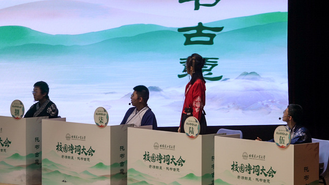在四对四的团体赛第一环节,选手们就展现了丰厚的知识储备与冷静的判断能力,诗词纠错、文化常识、词句连线……所有题目无一例外地被选手们答对。“两两对抗”环节以“长风队”、“沧浪队”各获一面锦旗的比分结束。民乐合奏《云宫迅音》以恢弘而熟悉的旋律勾起了观众们的记忆,也将今天的比赛推向白热化阶段。经过“柳暗花明”“诗词接龙”两轮激烈交锋,伴随着竹笛《飞雪落梅》声声悠扬,古琴《兰陵王》弦音流转,“沧浪队”获得了团体胜利。决赛环节,“沧浪队”四位成员围绕评委抽取的“风”“云”“月”进行飞花令比拼,选手们思如泉涌、对答从容,最终来自生命科学与技术学院的本科生刘硕同学摘得本届诗词大会决赛的桂冠。