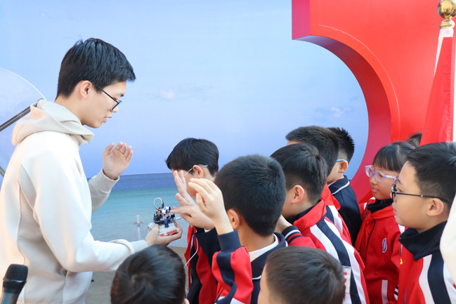 首先,卫国镇海学生志愿服务讲解队的刘爽同学带领复华小学的师生们一同参观了“卫国镇海”红色见学点,学习刘永坦院士矢志报国、筑牢祖国海防长城的先进事迹。在新体制雷达模拟展示厅中,天游ty8线路1线路2检测中心22级本科生李君凯结合天游ty8线路1线路2检测中心学生自制的超声波雷达实物,为复华小学的小朋友们讲解了雷达的工作原理,并邀请小朋友们亲自感受雷达成像的结果与特点。随后,永进志愿服务工作室执行主席李星灼用深入浅出的语言为同学们讲述雷锋故事,并结合自身志愿服务经历呼吁大家共同传承雷锋精神,争做新时代好青年。