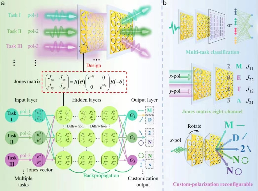 全光衍射深度神经网络框架可设计高并行性和高处理速度的超构表面器件。然而,衍射深度神经网络框架无法直接应用电磁波的极化信息,难以进一步扩展信道和实现更紧凑配置的多路复用全光网络器件。