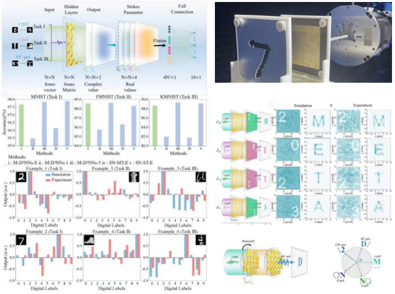 团队提出基于级联超构表面的矩阵衍射深度神经网络架构(MD2NNs),将琼斯矩阵直接作为优化变量融入到全光网络中,赋予其更大的设计自由度和更丰富的功能,实现了光电高任务容量的集成分超构器件、非交错式高效琼斯矩阵全参数优化调控器件、自定义极化信息加密超构器件。MD2NNs通过琼斯矩阵超构表面为研究人员提供了将极化并入电磁场和光场调制器的新策略,有望推动全光网络向多任务集成和更先进的功能器件方向发展。