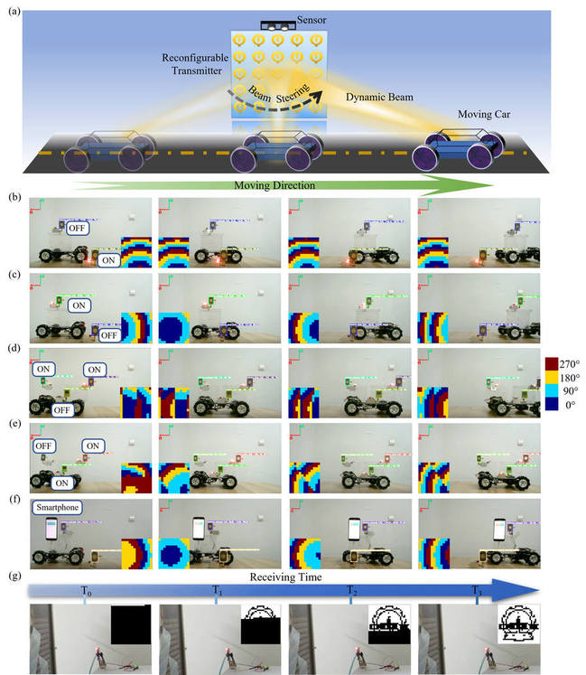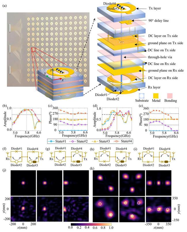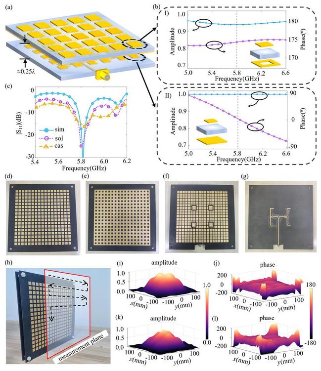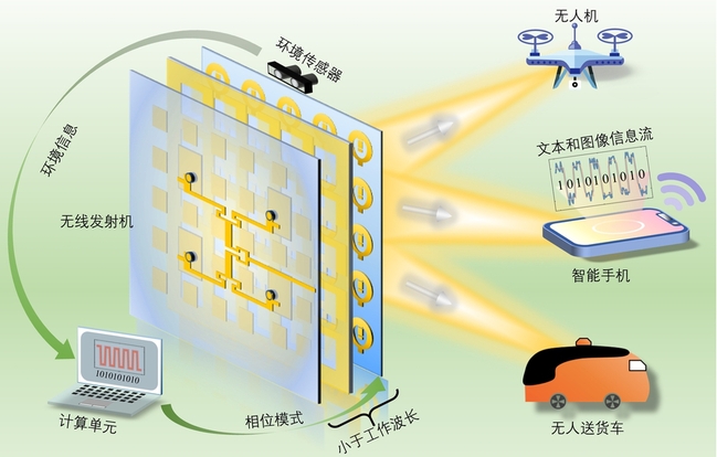团队提出基于可重构透射式超构表面的紧凑无线输能框架,该框架的核心组件包括平面波馈源和两比特相位可重构透射式超构表面,两者构成了多波束可重构的无线能量发射机(图2)。该发射机具有亚波长(0.8倍工作波长)剖面,其整体尺寸与27寸液晶显示器相当。通过联合深度学习驱动的环境传感器,该无线能量发射机可对多个运动中的设备进行检测和定位,并可完成对这些设备同时传输无线能量和信息。平面波馈源可在近场区域生成近似于平面波的均匀波前,进而完成对超构表面的激励,使得系统剖面降低到亚波长尺度,相较于目前主流激励方案的亚波长尺度降低了一个数量级(图3)。两比特可重构透射式超构表面由169个结构单元组成,通过时空可编程调制方案实现对波前相位的精准控制(图4)。近场平面波馈源和可重构透射式超构表面结合组成无线能量发射机,可向多个目标(如智能手机和无人机)无线传送能量。此外,该框架还包含环境传感器和智能计算单元。环境传感器用来收集待充电目标数量和位置等动态信息。智能计算单元处理来自传感器的信息,从而生成特定相位模式以控制无线能量发射机。在无需人为干预的情况下,该发射机可在随机环境中实现对多运动目标的无线能量及信息传输。