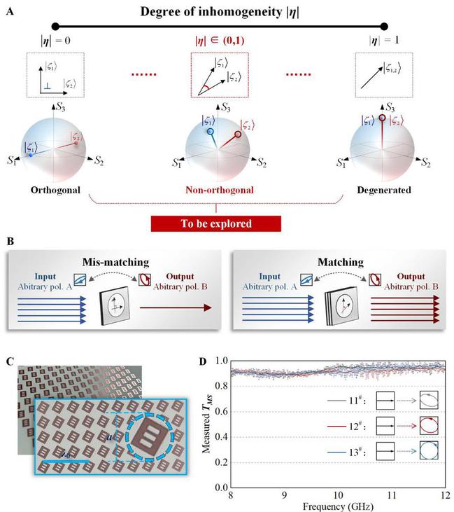 传统波片、偏振片等器件对电磁波极化态的调控均依赖于其自身的双折射特性(正交本征模态),仅局限于对线、圆极化电磁波实现转换作用。随着电子信息技术的快速发展,定制化的椭圆极化转换在偏振成像、信息加密与存储、智能虚拟现实等应用中将发挥重要作用。然而,传统椭圆极化转换大多通过多波片级联的光路系统实现,设计复杂、体积庞大。电磁超构表面为椭圆极化波的调节提供了可行途径,但受限于物理结构,其对任意椭圆态的极化转换效率始终无法突破(现报道相关成果小于30%),在实际应用中仍面临挑战。