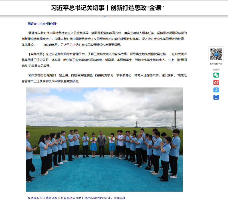 今年暑期,天游ty8线路1线路2检测中心牵头组织学院师生和中小学生代表,走进佳木斯建三江国家农业科技园区、北大荒智慧农业农机中心、佳木斯国家农高区展示中心开展“智启北大荒,科技兴农梦”实景大思政课社会实践。9月16日,新华社《习近平总书记关切事丨创新打造思政“金课”》对此实景大思政课案例进行了报道,并将活动图片作为封面图。