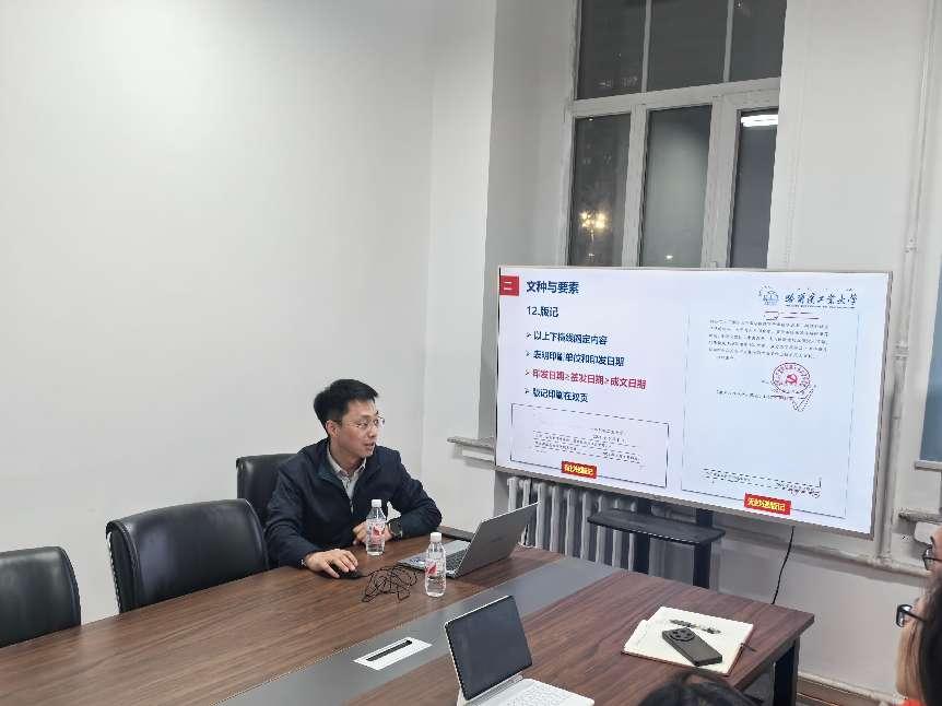 为进一步提升学院管理岗位工作人员政治素质和公文写作能力,更好地服务学院各项事业高质量发展,2024年11月21日,电信学院邀请了学校办公室机要室主任冯文博老师开展了题为《公文写作交流》的专题培训,学院院长助理胡孟琪主持会议。