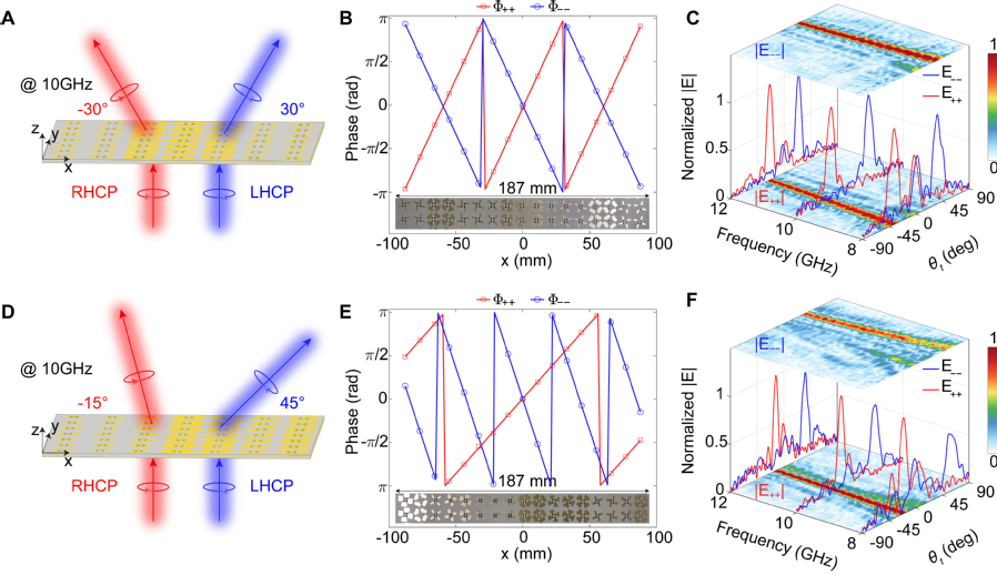 圆极化电磁波凭借其传播稳定性(抗干扰性强、相位稳定)以及携带自旋轨道角动量的独特性质,在卫星通信、量子光学等尖端领域被广泛应用。在微波波段上,最成熟且直接的应用方式是圆极化的共极化发射和接收,但目前尚无关于共极化通道相位调节的方法见诸报道。
