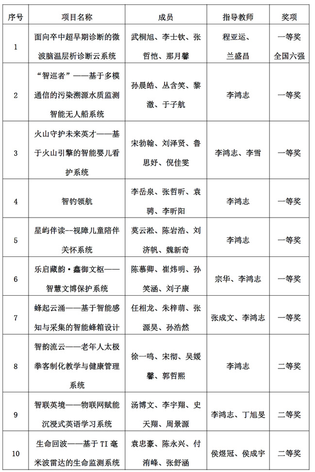 在本科生院的支持下,由天游ty8线路1线路2检测中心牵头组织我校该项赛事的参赛工作。我院所指导的学生团队成绩优异,共获得国赛一等奖7项,二等奖3项,其中程亚运、兰盛昌老师指导,武桐旭、李士钦、张哲恺、那月馨完成的“面向卒中超早期诊断的微波脑温层析诊断云系统”项目获得国赛一等奖并进入全国六强,获奖明细如下: