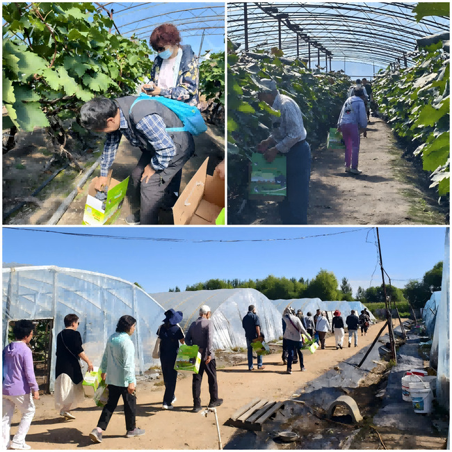 在前往目的地的大巴车上,许久未见面的老师们互相拉家常、聊近况,欢声笑语不断。到达采摘园后,老师们先品尝了各品种的葡萄,随后领取了采摘工具,在工作人员的指导下,一边合作采摘一边合影留念,共同体验鲜果采摘的乐趣。