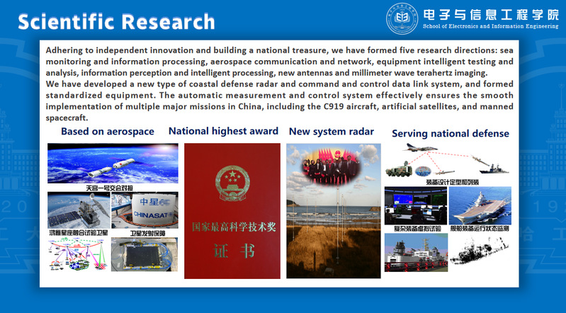 The school has formed a group of disciplinary directions with distinct national defense and aerospace characteristics, combining international academic frontiers and major national strategic needs. In the past five years, we have undertaken a total of 493 scientific research projects, with a total research funding of 421 million yuan. We have published over 400 SCI papers, authorized over 400 patents, and won one first prize of the National Science and Technology Progress Award and 15 provincial and ministerial level Science and Technology Progress Awards. Developed China's first high-frequency ground wave over-the-horizon radar, designed and implemented a dedicated data link system for precise target tracking, solved multiple key technologies in national defense and aerospace equipment, improved the technical level and capability of China's defense equipment, and broke international monopolies; We have established a dedicated communication system brand with independent intellectual property rights to safeguard the country's economic construction and development.